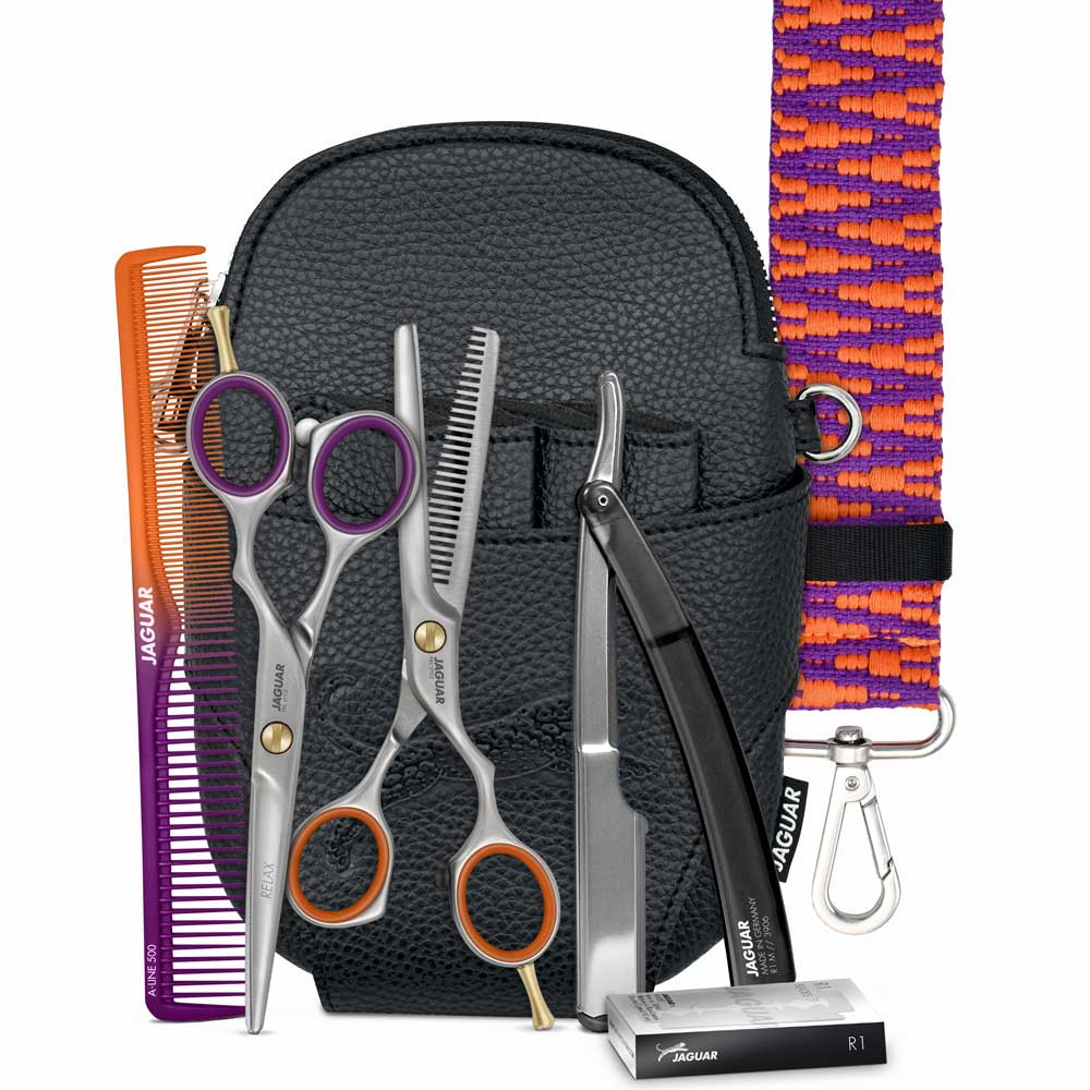 professionnels JAGUAR PRE STYLE Rasoir R1 M BLACK avec support métallique pour toutes lames standards 10 lames R1 inclus Peigne de coupe A-LINE BICOLOR 7.25"" CROSSBAG (trousse holster), format L 14,5 x H 21,5 x P 3 cm.