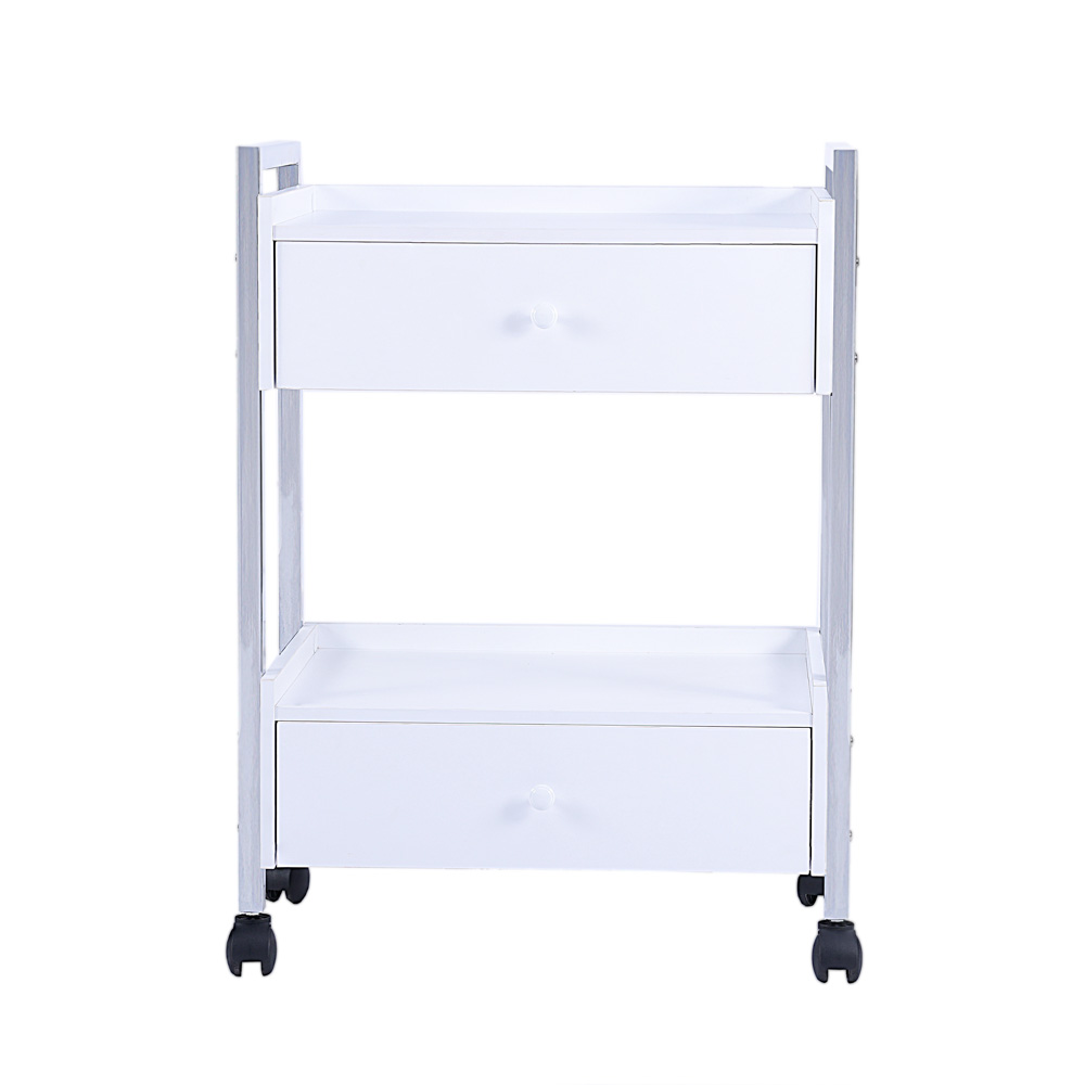 <ul><li>Chariot de beauté</li><li>2 étagères et 2 tiroirs</li><li>Structure solide en MDF et métal</li><li>Sur roulettes</li></ul>